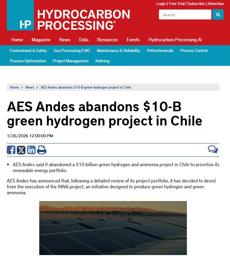 I subscribe to several journals that cover the process and energy industries. Almost every week, my inbox includes a report such as the one I received today from Hydrocarbon Processing. Its title is, AES Andes abandons $10-B green hydrogen project in Chile. The opening paragraph reads: